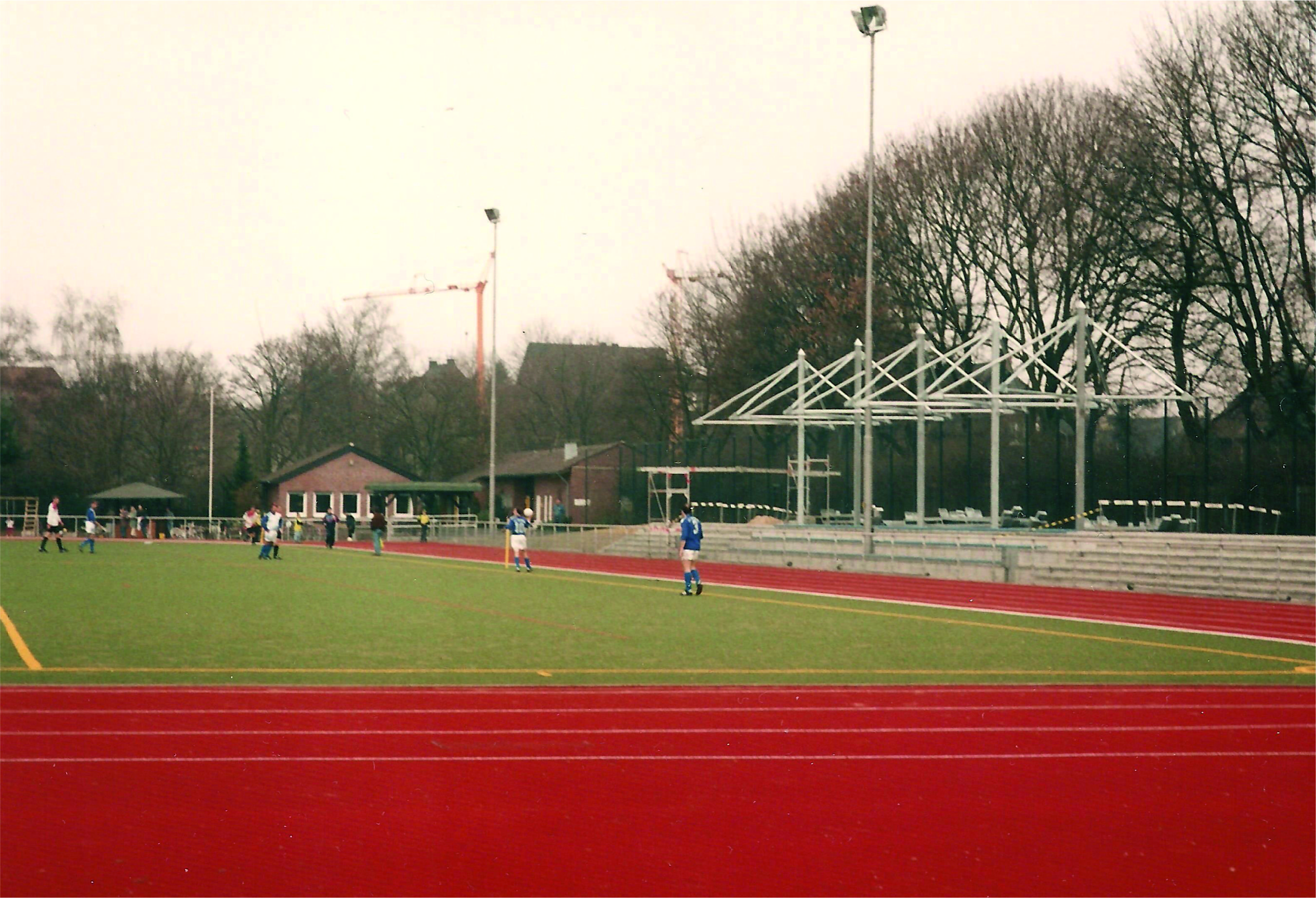 Zur besseren Beobachtung, folgte bereits zwei Jahre nach dem Belag die neue Tribüne. Die letzten baulichen Veränderungen rund um die Platzanlage ergaben sich in den Jahren von 2009 und 2010. Der Kunstrasen hatte bis dato einige Spuren von der stetigen Dauerbelastung davongetragen und wurde durch ein tieferes, mit einer Granulat/Sand-Mischung aufgefülltes Geläuf ersetzt. Außerdem entstand in der alten Hausmeisterwohnung des städtischen Gymnasiums die neue Schiedsrichterkabine der DJK.
