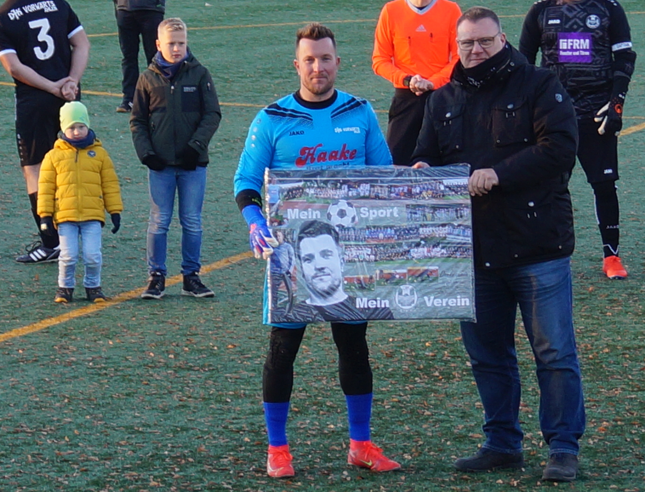 Dazu kam es am Samstag, bei frostigen Temperaturen, auf dem Lindensportplatz. Zuerst traf die zweite Mannschaft der DJK auf die alten Herren, bei denen Splett heute noch regelmäßig hinter das Leder tritt. Im Anschluss das Legendenspiel. Vor dem Anstoß ehrten Vereinsvorsitzender Martin Metzner und Thomas Vienhues den Torwart und überreichten ihm zum Andenken an viele Jahre Vorwärts Ahlen eine Collage aus den viele Jahren Seniorenfußball. Im Spiel trat dann die erste Garde gegen die Meistermannschaft aus 2013 an, die Generation in der auch Splett in die Bezirksliga aufstieg. Ob sie noch etwas von dem Zauber aus der Aufstiegssaison behalten hatten konnte zunächst keiner voraussagen, doch es zeigte sich, dass das Zusammenspiel immer noch perfekt Stimmte. Alte Dribbelkünste trafen auf bekannte Außenstürmer und viel gesehene Spielzüge über die außen, rein ins Zentrum und durch die Mitte rein ins Tor. Da hatte es die aktuelle Garde durchaus schwer, gerade wenn einer wie Splett als Schlussmann für Ordnung sorgt.