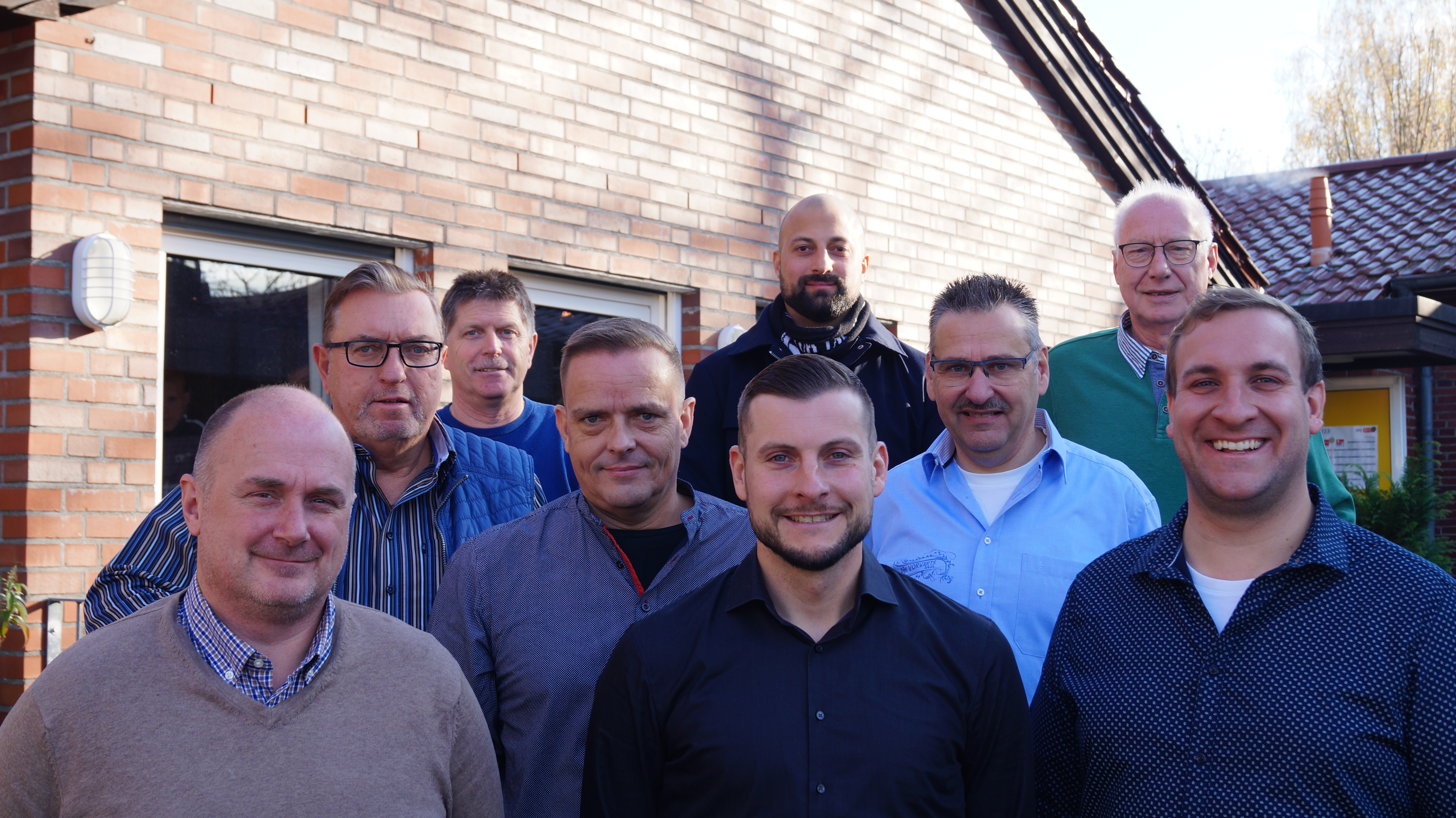 Der Fußballvorstand der DJK Vorwärts von links Sebastian Franke (Jugendvorstand), Werner Splett (Jugendkoordinator), Peter Meier (Stellvertretender Fußballobmann), André Fisse (Jugendgeschäftsführer), Carsten Menker (Stellvertretender Vorsitzender), Daniel Chugthai (Geschäftsführer), Thomas Vienhues (Stellvertretender Geschäftsführer), Herbert Stemmer (Geschäftsführer Finanzen), Benedikt Miketta (Vorsitzender) (Nicht im Bild: Simon Maack (Fußballobmann), Bernd Mehring (Platzkassierung), Klaus Sehlmann (Platz- und Gerätewart))